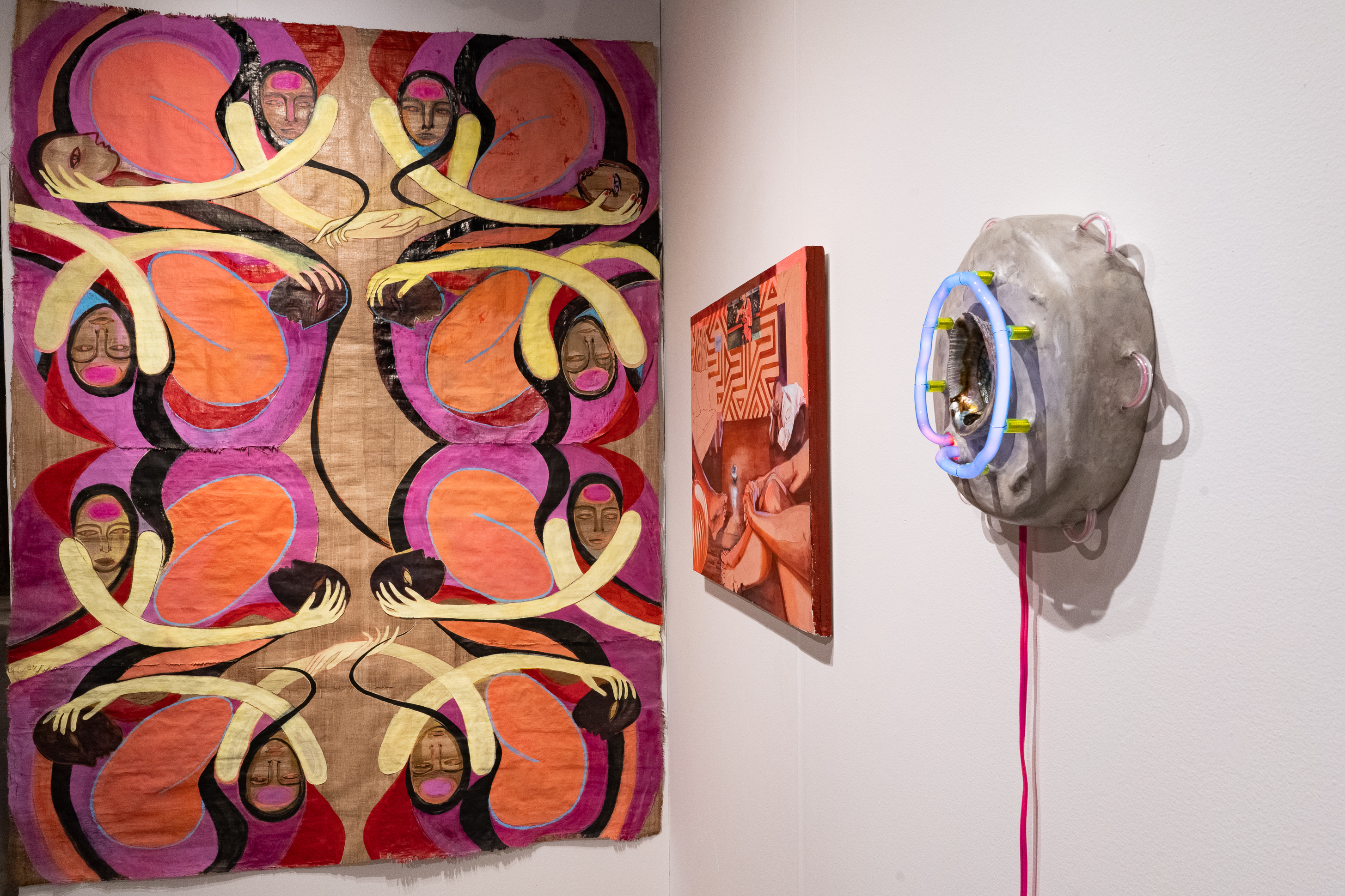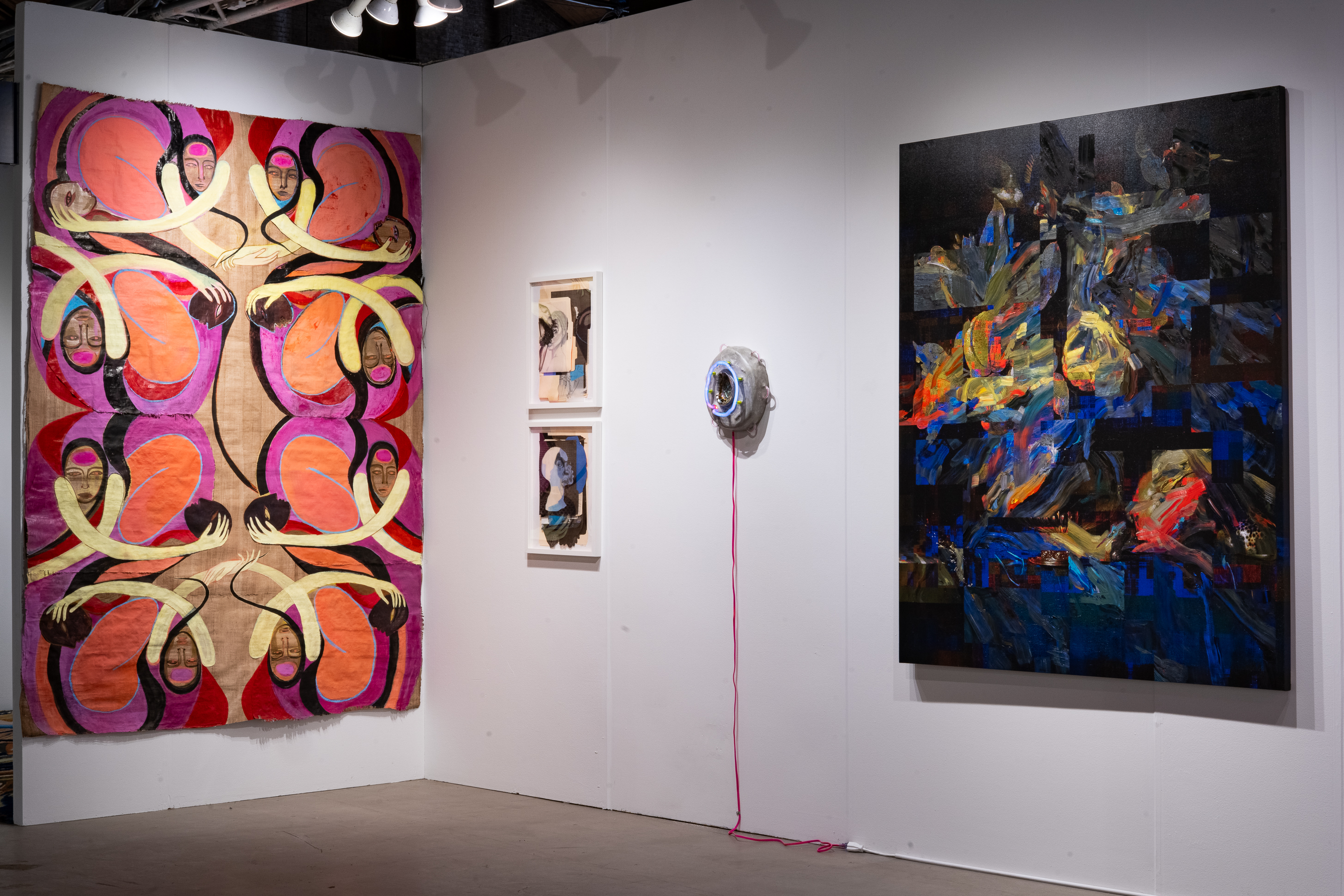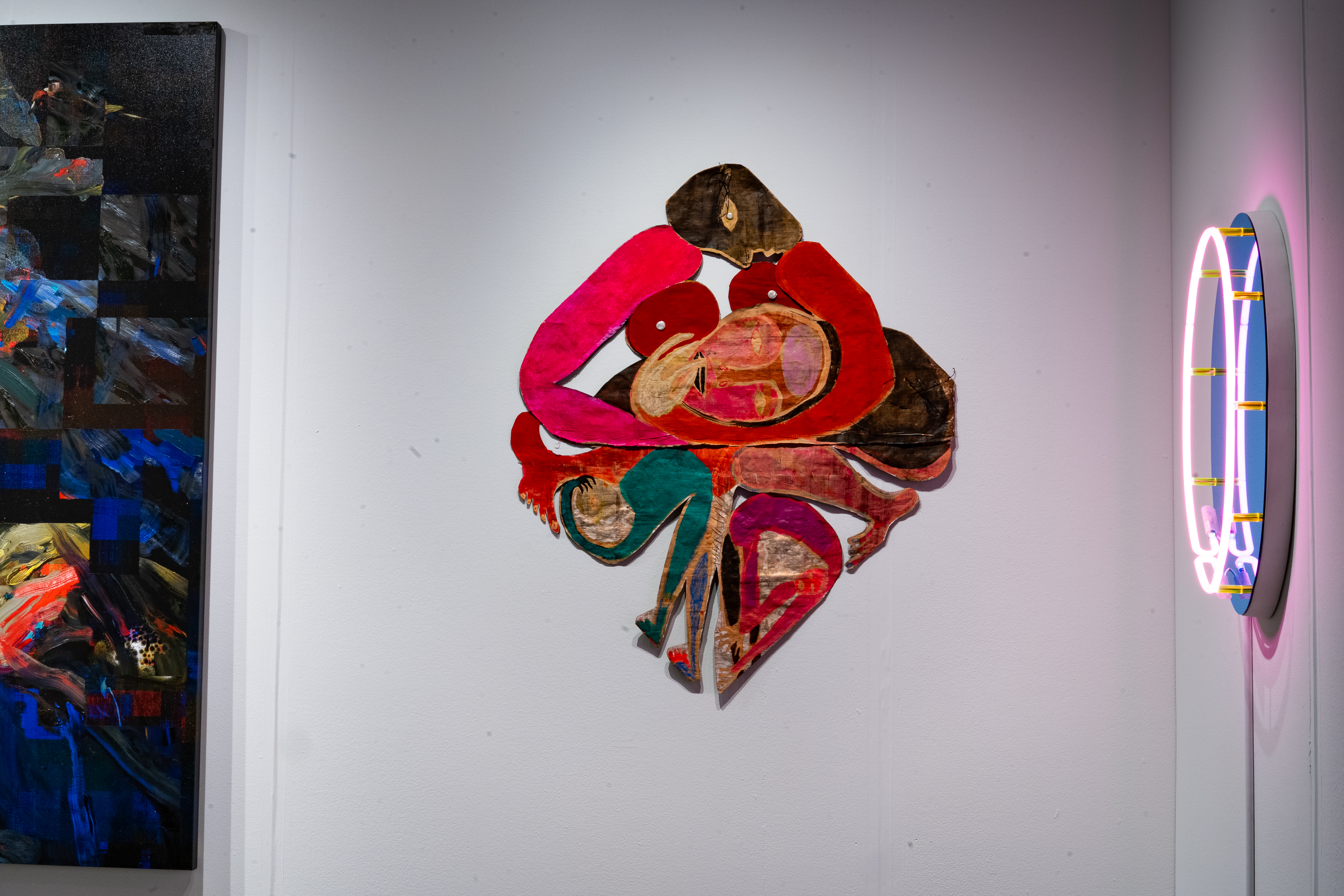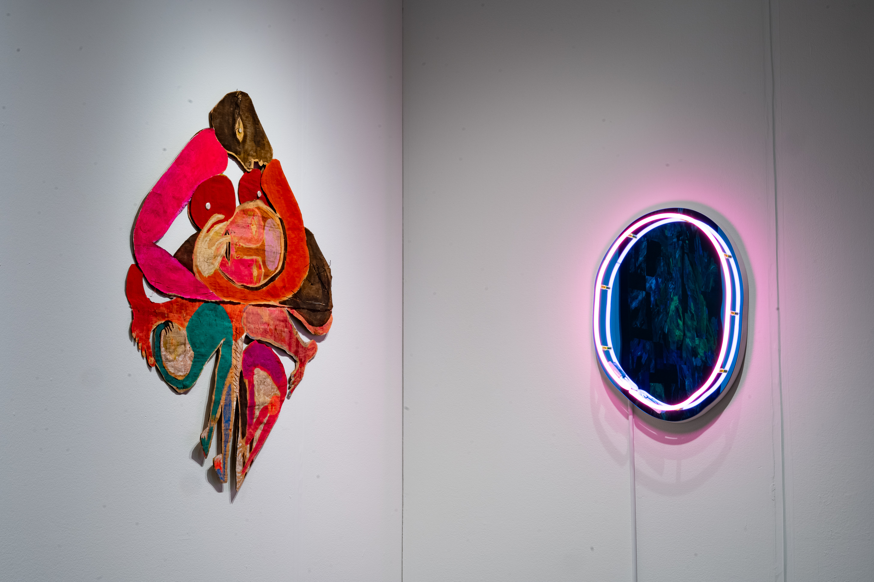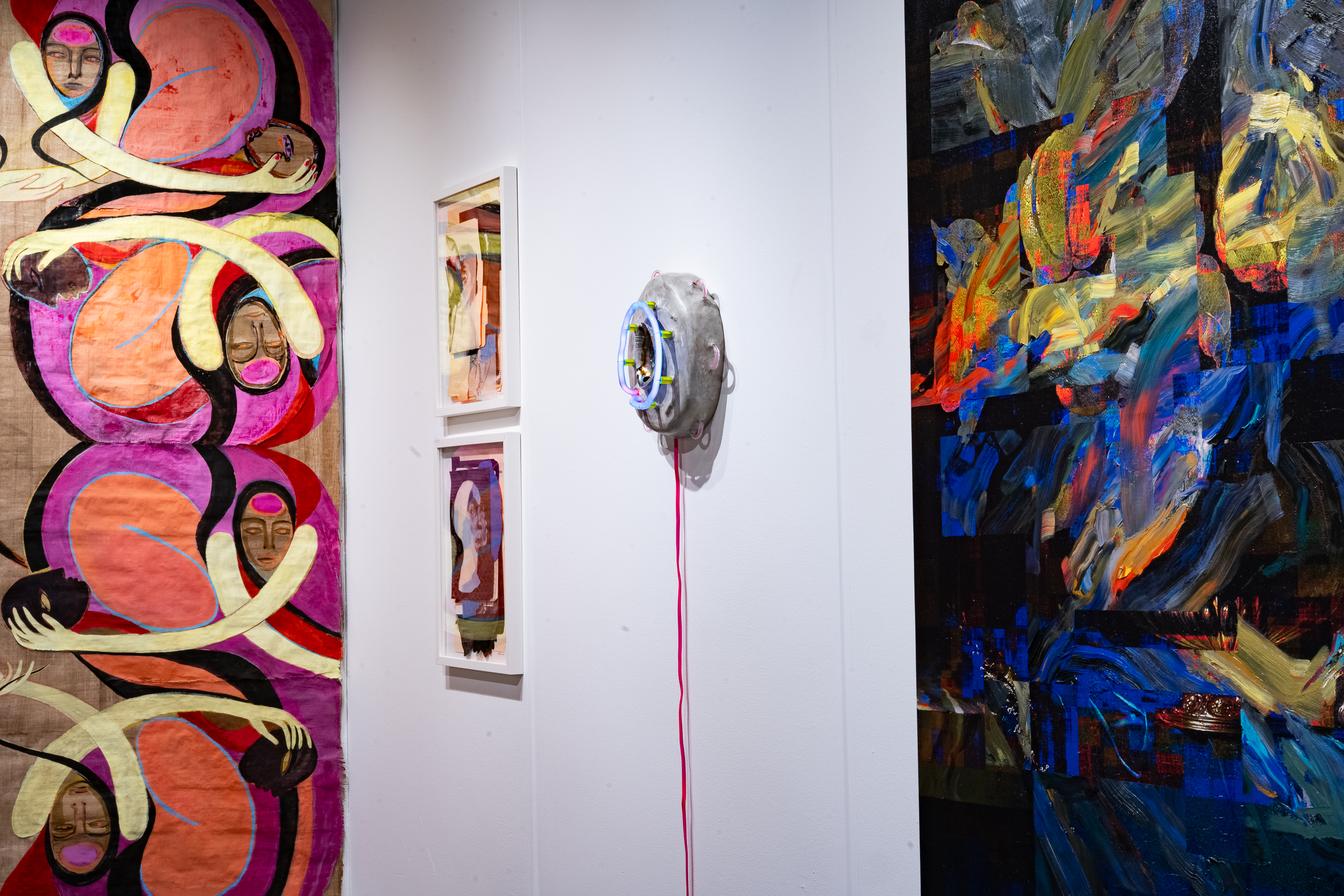 While Calvert’s works might present as traditional floral paintings at a glance—they combine generative AI (which the artist feeds a small dataset of Dutch masters' tulip paintings) with a complex process of masking and impasto oil painting, resulting in an uncanny hybrid of the contemporary and the traditional. Kline’s work focuses on social entanglement, her materials matching her primeval themes. Through vibrant sculptural works and paintings on papyrus, wood, bronze, and ink, the artist engages viscerally with notions of embodiment, trauma, displacement, and motherhood. Olivia works in fresco-secco painting and collage, often employing found historical documents and records. Her work traces the movement of/control over Black bodies—specifically Black women’s bodies—simultaneously manifesting queer spaces of autonomy and repose. Ruiz transmutes elemental materials into expertly-fabricated neon light sculptures that are astrological, modernist, and retro-futurist all at once.