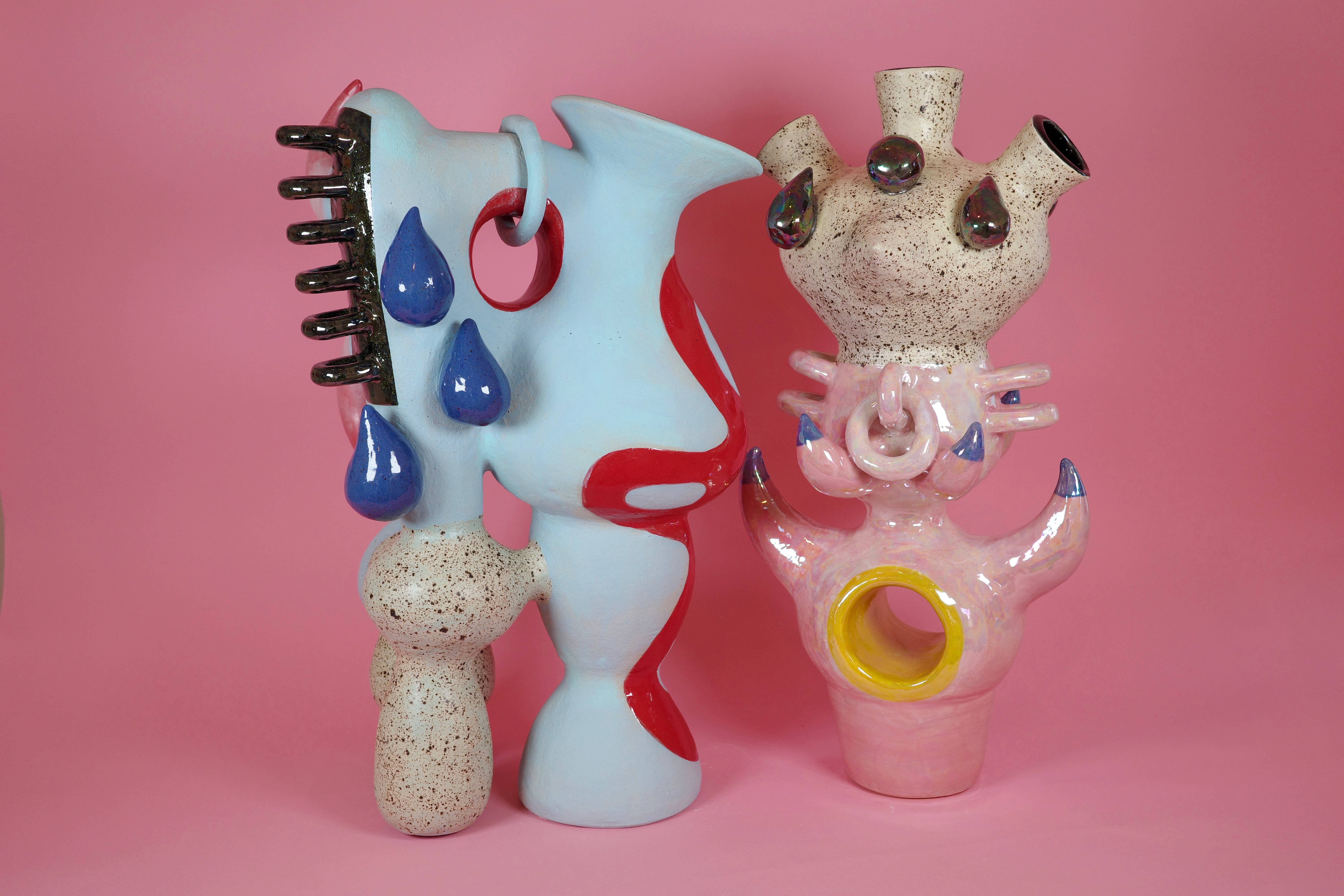 Paloma Wall’s totemic ceramic vessels are bent, pierced, horned; some even seem to weep large ceramic tears, like surrealist memorial urns. Form and function seem to wrestle for prominence in Wall’s expertly hand-crafted works, which sprout appendages from their alien-like abdomens, some of which sport large cavities where the stems of flowers might rest in a more traditional vase. It’s as if the vessels have adapted like plants over millennia to adapt to their environment: with camouflage, vestigial limbs, predator-deterring thorns, and bright poison-warning coloration. This sense of animism, deftly imbued in such a delicate medium, is the magic of Wall’s works.