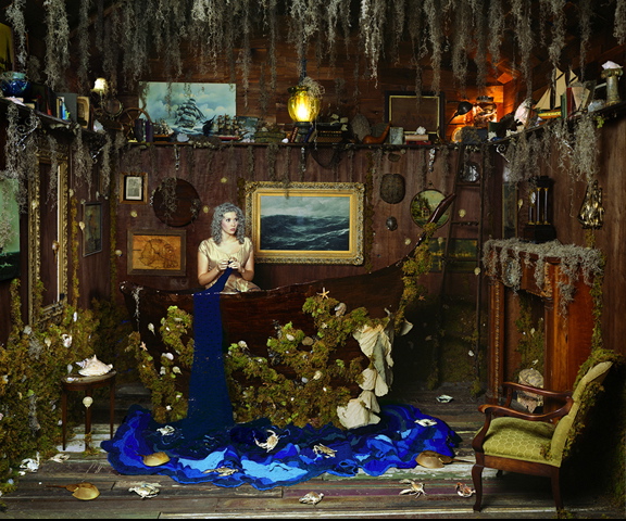 Tinney Contemporary is pleased to present Scenes - an exhibition featuring work by photographer and installation artist, Dorothy O'Connor. O'Connor's Scenes is an ongoing series that centers around transforming spaces, often a room, into fantastical landscapes which frequently utilize elements of nature and the natural world to tell a story. Each concept, shaped predominantly by events in O'Connor's life, create a sort of conceptual autobiography-an interpretation of her own dreams. Building these life-sized installations also allows the artist to literally live inside her own imagination, if only for a short time, and satisfies her need to create a more aesthetically pleasing reality. Each project takes months to complete, allowing O'Connor to fully immerse herself in its meticulous details. She enjoys creating many of the components in each set by hand: crocheting the ocean, crafting hundreds of paper birds, hand-stenciling wallpaper, weaving roots from jute, etc. Learning a new skill each time she builds a new scene helps to keep the process fresh.