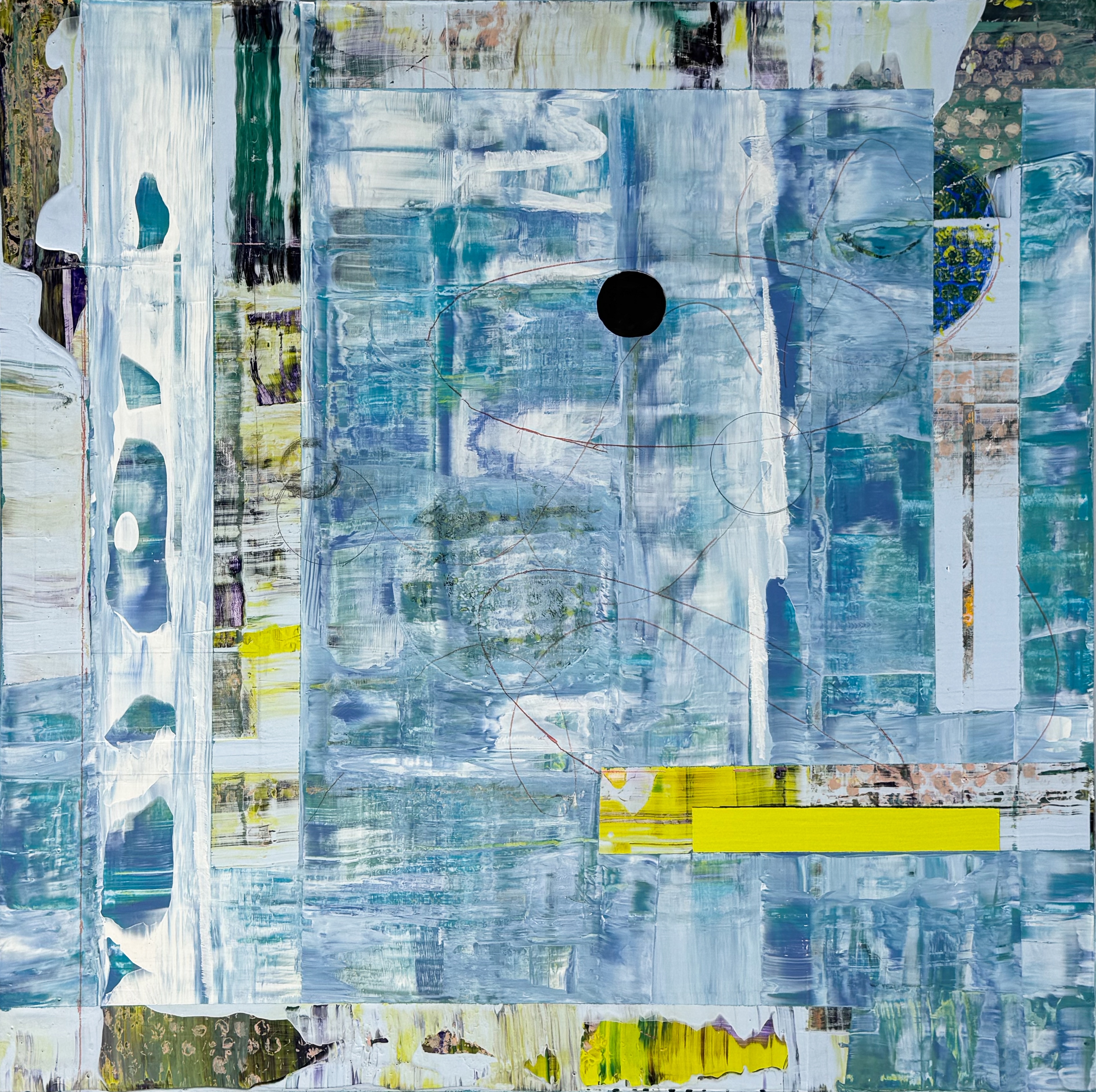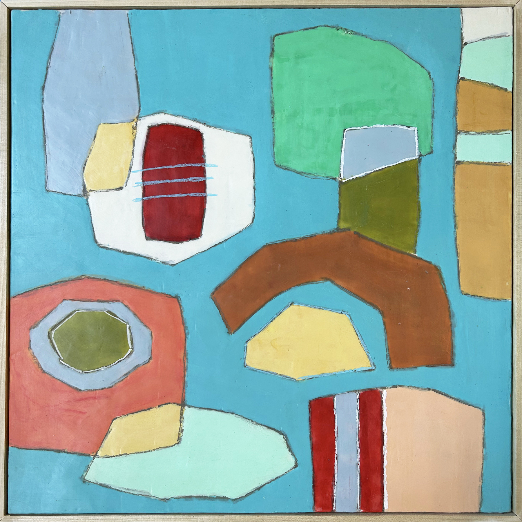 Carried out in her own always-evolving color palette, the forms seem to vibrate by virtue of an Albersian color interaction. By exploiting various acrylic mediums and varied opacities, Silverman further complicates these color relations through transparent top layers which allow the history of paint to shine through. This pentimento deepens the shifting composition and color interaction, yielding an inviting sense of depth—distinct from the flatness that is emphasized in much geometric painting.