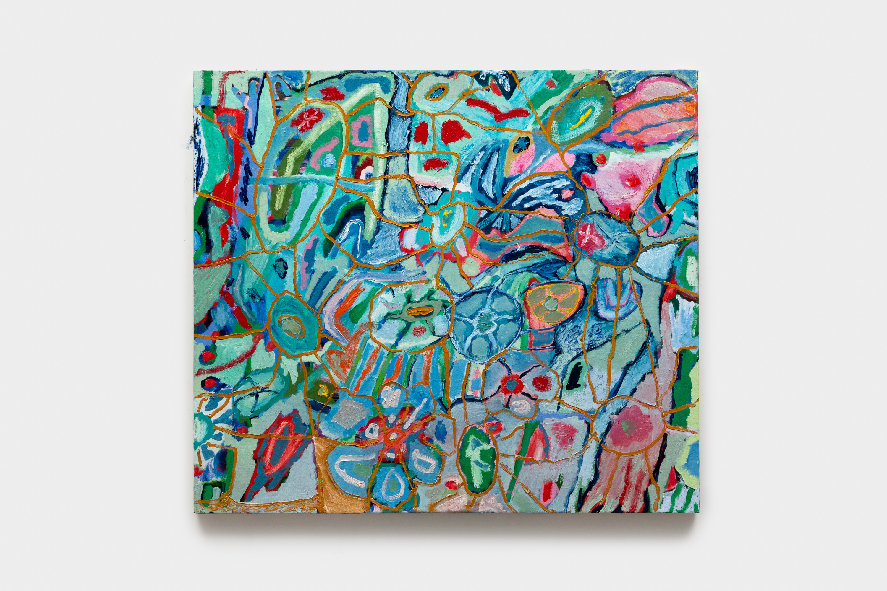 Hannah Rose Dumes’ abstract oil paintings feature an ecstatic use of intense hues, each piece its own celebration of color, a carnival of intersecting shapes and vibrational color relationships. Dumes paints in oil on top of a foundational layer of acrylic washes. It’s an open and exploratory process that embraces personal symbolism and ambiguity. The forms are familiar, bearing subtle reference to the body or to nature, but remain implacable. Dumes’ universal, unassuming set of symbols—flowers, spirals, eggs, shells, breasts, suns—melt into one another like overripe fruit on an impossibly hot July afternoon. The works elicit a giddy sort of headrush, like bees drawn to flowers, color-drunk.