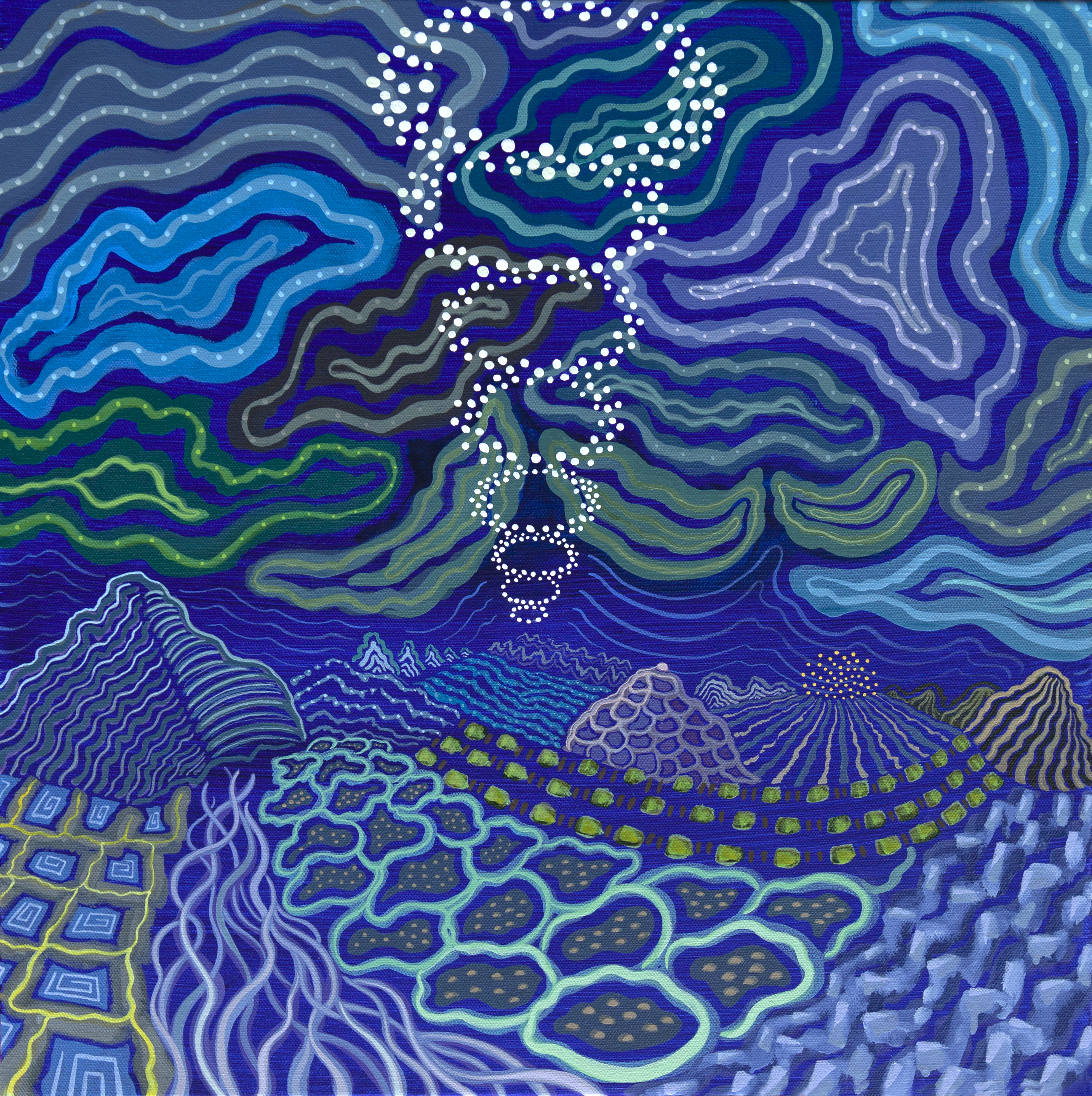 This dynamism invites the viewer to play at pareidolia. What do you see? Vague impressions at first—but the longer you look, things begin to take shape: structures, landscapes, figures. Eyes, ears, arms. The sun setting over the sea, afterimage burned into your retinas, still there when you shut your eyes.